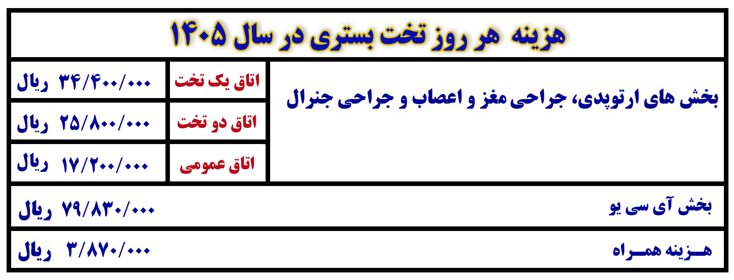 ضمناً: حداقل هزینه یک روز بستری در تخت بدون احتساب مانیتورینگ، دارو، ویزیت، مشاوره پزشکان، آزمایشات و گرافی ها ... در بخش ها به قرار زیر است: